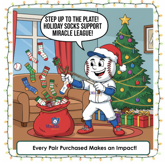 Cartoon Homer mascot is delivering a Santa bag of Miracle League and other fun socks to celebrate the season!