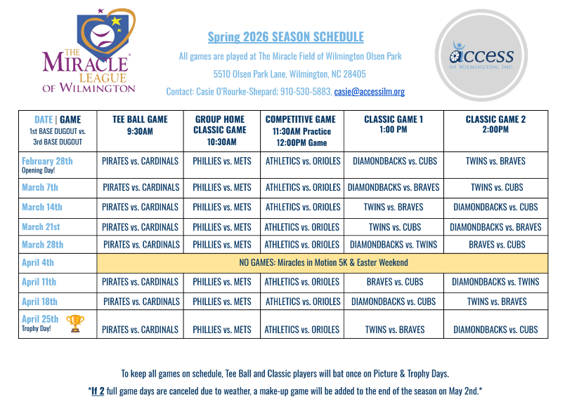 All games and practices are played at the Miracle Field located at 5510 Olsen Park Lane in Wilmington, NC. The specialized 33,000 square foot field is made of a flat, rubberized surface that is barrier free for all Miracle League All Stars!